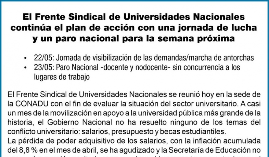 En tanto, desde el Frente Sindical dejaron bien en claro que “a casi un mes de la movilización en apoyo a la universidad pública más grande de la historia, el Gobierno Nacional no ha resuelto ninguno de los temas del conflicto universitario: salarios, presupuesto y becas estudiantiles”.